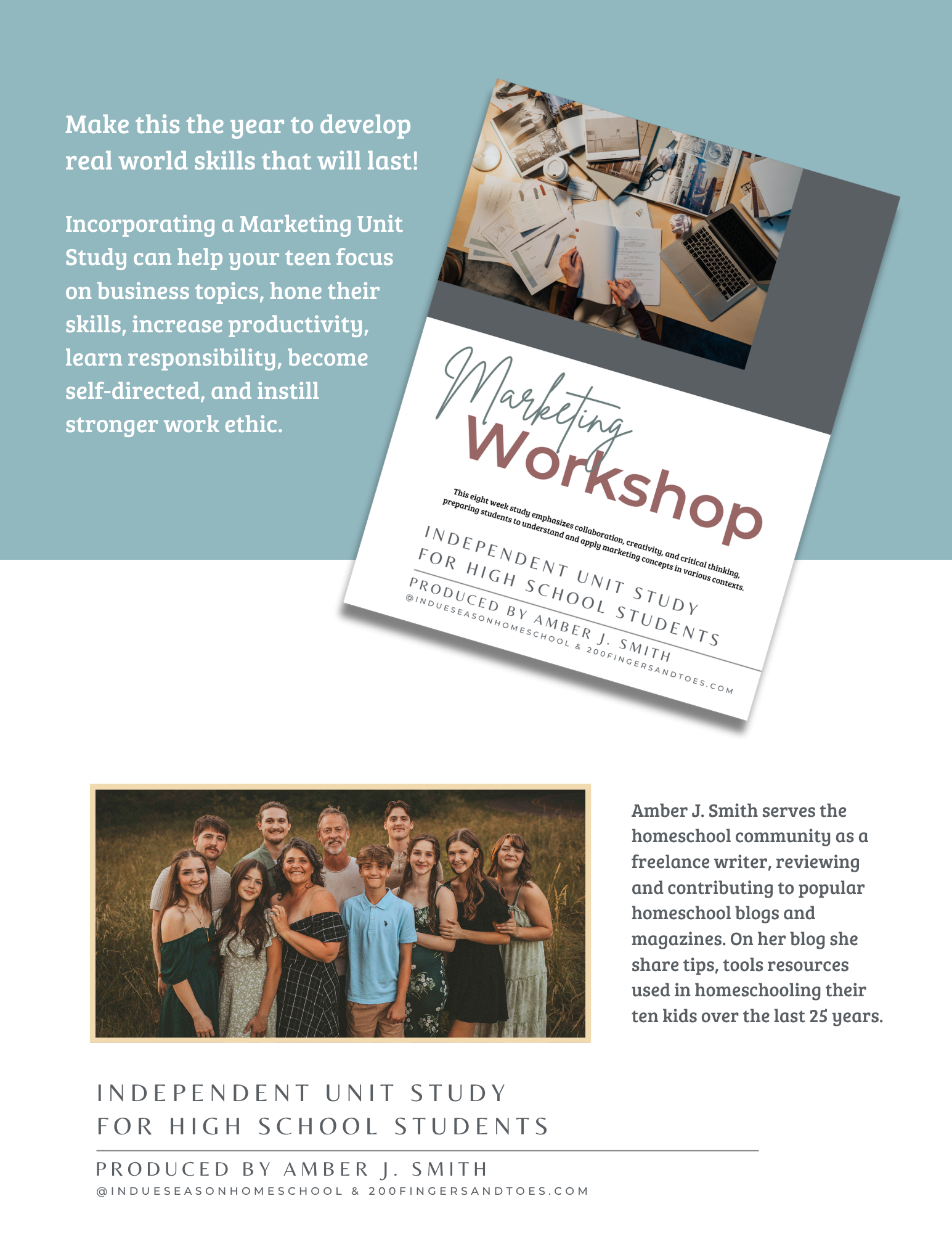 This year we are using our Marketing Unit Study to focus on business topics, hone skills, raise productive, responsible, self-directed teens, and instill a great work ethic. This is a huge change from our regular approach, but we are excited and the kids are responding well to the changes. In this article I will share what we are doing this school year and more about building unit studies yourself.